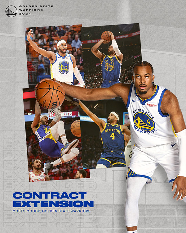 勇士官方晒海报,正式宣布与穆迪达成3年3900万美元的续约合同,这是一份三年全额保障合同,下赛季正式生效;勇士官推还晒出穆迪的集锦来祝贺其续约。