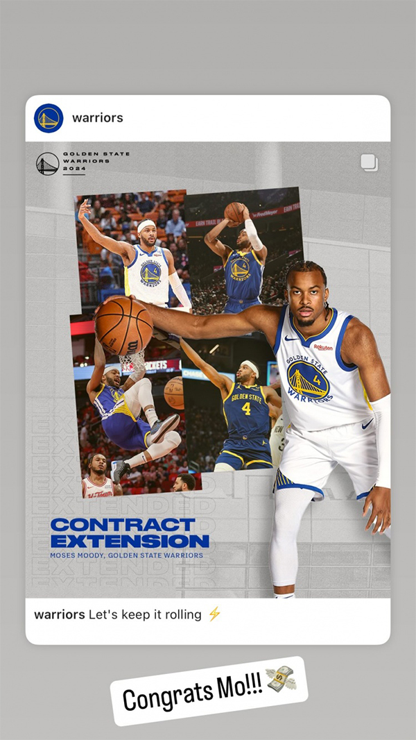 勇士球星库里转发穆迪提前续约海报,并写道:“祝贺你啊摩西!!!