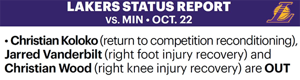湖人官宣揭幕战伤情:伍德(右膝伤病康复)、范德比尔特(右脚伤病康复)和科洛科(身体状态恢复)都因伤缺战森林狼,他们三人都缺席了今年全部的季前赛;詹姆斯、浓眉、里夫斯、八村垒、拉塞尔等剩余球员都可以出战。