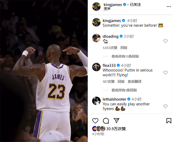 詹姆斯晒出自己对阵国王的一些高光时刻,漂移后仰、连中三分疯狂庆祝,并配文写道:这是你以前从未做过的事!(王冠表情);老詹动态引热议,拉塞尔在评论区盛赞詹姆斯是GOAT。