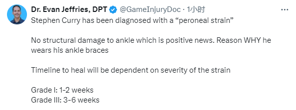 医学专家Evan Jeffries表示,库里的伤情确诊为腓骨扭伤, 脚踝没有结构性损伤,这是个好消息,这与他戴护踝有关系,康复时间取决于拉扭伤的严重程度,一级拉伤缺席1-2周,二级扭伤缺席3-6周。