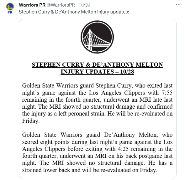除了库里之外,勇士还遭其他伤病打击,勇士官方表示德安东尼-梅尔顿在与快船的比赛中,第四节还剩4分25秒受伤离场,他在赛后接受了背部核磁共振检查,结果显示没有结构性损伤,他的伤情为下背部拉伤,本周六接受复查,至少缺席接下来的两场比赛。