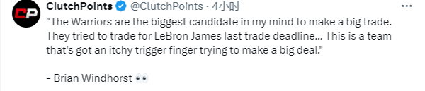 来源:直播车11-08 20:13直播车讯NBA常规赛继续进行,到目前为止,勇士拿到7胜1负的战绩,与太阳雷霆并列西部第一,在这样的情况相爱,名记Brian Windhorst报道称:勇士队在我看来仍是最有可能进行重大交易的球队。他们在上个交易截止日时曾尝试交易得到勒布朗-詹姆斯,这是一个急于想要达成大交易的球队。