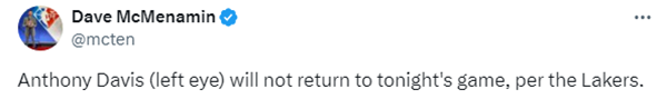 下半场,第三节湖人又被猛龙拉开分差,60-68后浓眉命中弧顶三分,随后送出惊天大帽,老詹反击一条龙上篮得分,湖人起势疯狂反扑,可比赛打到5分18秒,浓眉在禁区单手大帽珀尔特尔,却被对手戳到眼睛,浓眉捂着眼睛痛苦倒地滚翻,痛得怒砸地板,湖人队医以及詹姆斯等人都围过来,缓了一段时间后,浓眉站起来,径直返回更衣室。
