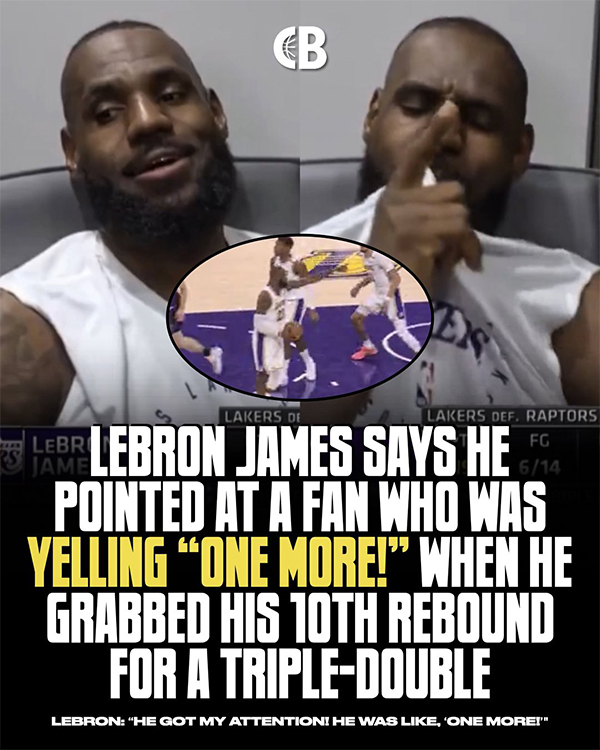 在湖人20分大胜猛龙的比赛中,末节最后时刻詹姆斯达成三双后指向观众席,赛后詹姆斯表示:他确实一直对我喊叫,引起了我的注意,他说,‘再来一个篮板!’我说,‘什么?’他就喊道,‘差一个了!’所以,我又抢了一个篮板,并指向他,向他表示我在听他的话。所以,我感谢那边的那个家伙。