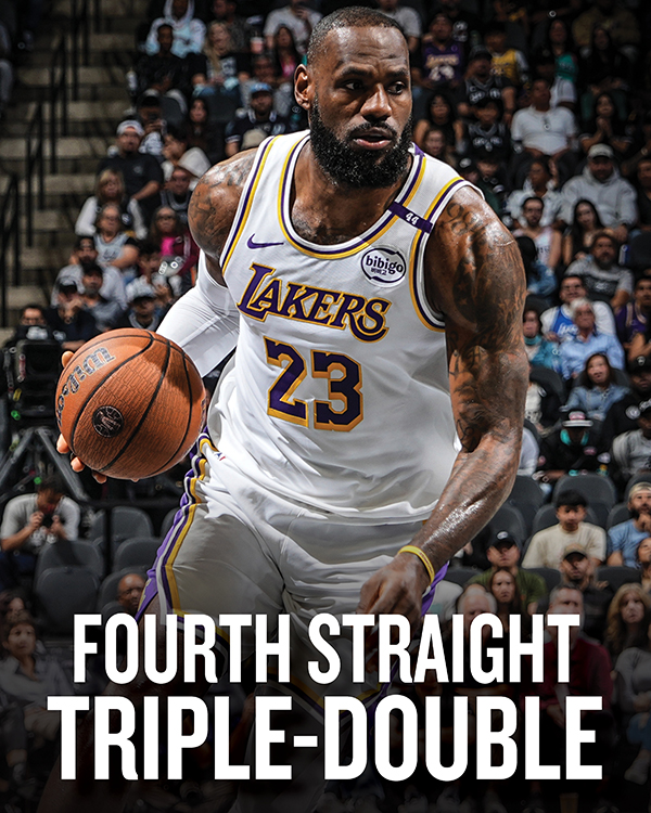 1、詹姆斯职业生涯第一次连续四场拿到三双