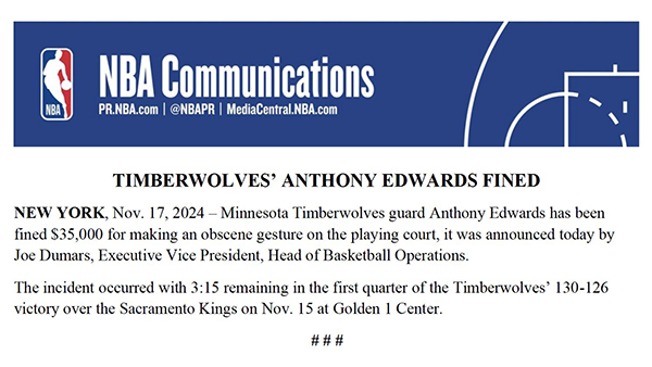NBA官方宣布,森林狼球星安东尼-爱德华兹因场上不雅手势被罚3.5万美元;在此前NBA杯A组小组赛中,森林狼加时130-126战胜国王,比赛期间,爱德华兹曾经朝球迷竖中指,这一幕发生在首节3分15秒,爱德华兹持球突破撞倒对手吃到进攻犯规,华子吃到两犯不得不下场,返回替补席期间,国王球迷出言不逊,华子竖中指回应。