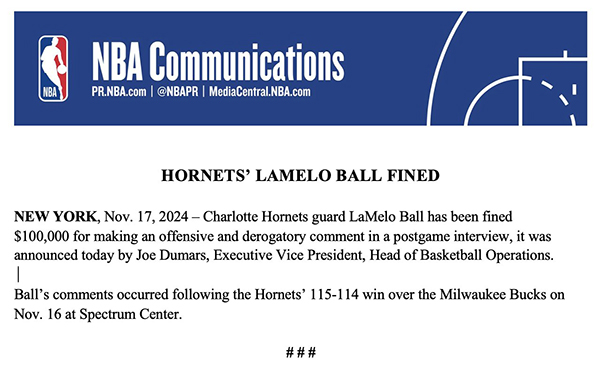 NBA官方宣布,夏洛特黄蜂队后卫拉梅洛-鲍尔被罚款10万美元,原因是他在周日的赛后采访中发表了攻击性和贬损性言论;在黄蜂险胜雄鹿的比赛赛后,接受采访时,三球公开称他们不是同性恋。