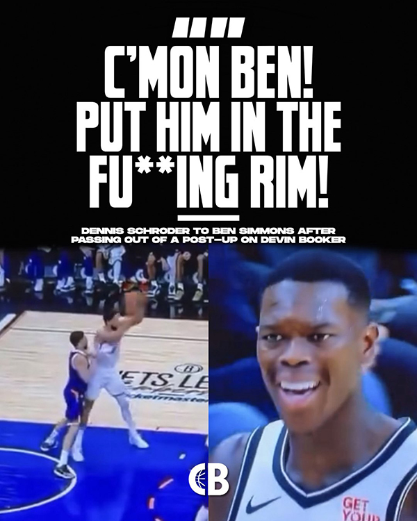 还有一幕是西蒙斯持球推动反击,之后错位面对布克,西蒙斯明显不敢发力,突然传球搞得施罗德很无奈,对此,施罗德爆粗怒斥西蒙斯:本!给点力啊!你碾啊!进篮下啊!干进去啊!