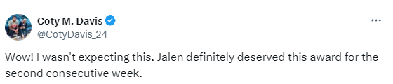 浓眉场均27+16当选西部周最佳,但火箭新星杰伦-格林场均36.3分6篮板且场均命中6记三分却落选引热议,火箭随队记者Coty M. Davis更推感叹:哇,我没想到会是这样,杰伦-格林绝对当之无愧可以获得连续第二周获得周最佳!另一名火箭队记Jackson Gatlin则直言:杰伦-格林被抢劫了,这很荒谬。