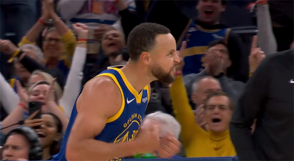 下半场,第三节库里终于命中三分球,外线造犯规三罚全中,带领勇士一波流追到仅落后3分,可之后勇士进攻断电,又被森林狼拉开分差,勇士再次反扑追分,这一节最后时刻库里轰进不讲理准压哨三分,露发狠表情疯狂庆祝。