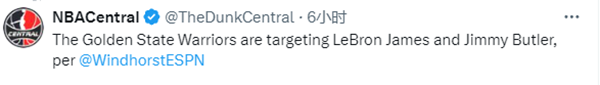 Brian Windhorst还表示詹姆斯是勇士队的另一个目标任务,报道称:詹姆斯和库里联手会非常吸引人,不过勇士上赛季交易截止日前向湖人询价被拒绝了;今年奥运会詹姆斯和库里科尔合作过,他们显然会关注现在的情况,若勇士明知道这事儿不可能,他们是不会有所行动的;最终一切还是看詹姆斯,他有交易否决权,他想要湖人升级阵容,他还不想离开洛杉矶湖人队。