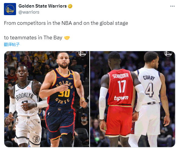 勇士官方晒出施罗德身穿篮网17号球衣的照片,欢迎施罗德来到湾区:从德国不伦瑞克来到湾区;勇士官方还晒施罗德与库里昔日在NBA赛场和国际赛场上对阵的画面:从竞争对手到成为队友。