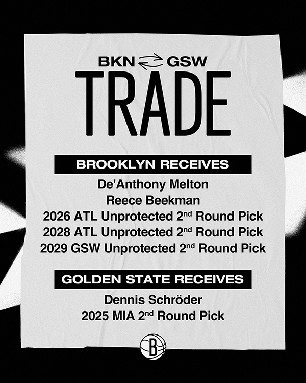 勇士和篮网都官宣以施罗德和梅尔顿为主体的交易正式完成,交易细节——勇士把梅尔顿、比克曼和3个次轮签送到布鲁克林,从篮网得到施罗德和1次次轮签。