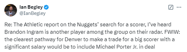 纽约记者Ian Begley报道,关于掘金队寻找得分手的报道,我听说布兰登-英格拉姆是他们关注的球员之一;掘金引援得分手的途径之一就是交易小迈克尔-波特。