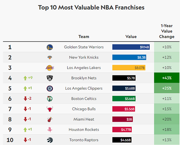 此外,布鲁克林篮网队的市值也值得关注,其市值飙升至57亿美元,相比去年增长了43%,在联盟中的排名连升9位,超越了洛杉矶快船队和波士顿凯尔特人队,升至第四位。篮网队主场巴克莱中心也成为了全球收入最高的体育场之一。