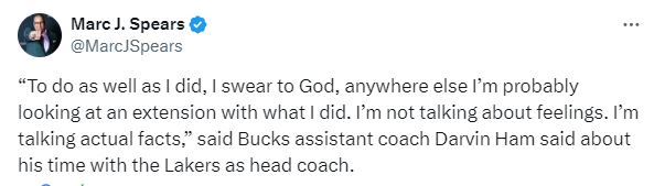 谈到被湖人解雇,哈姆表示:“很失望,我向上帝发誓,在其他任何地方,只要像我所做的那样出色,我都可能会得到一份续约合同;我没带情绪,我说的是事实,他们从无缘季后赛到进入分区决赛,成为站到最后的四支球队之一,然后赢下了季中锦标赛,克服了所有的伤病赢得附加赛,然后再次打进季后赛。
