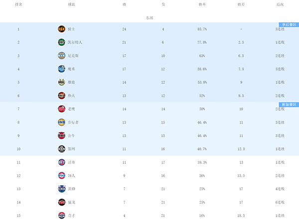 东部的格局还是比较清晰的,第二名属于卫冕冠军凯尔特人,落后骑士2.5个胜场的差距,值得一提的是,凯尔特人的胜场数量已经突破20场。尼克斯第三,魔术第四,雄鹿和热火排名直通季后赛区域。
