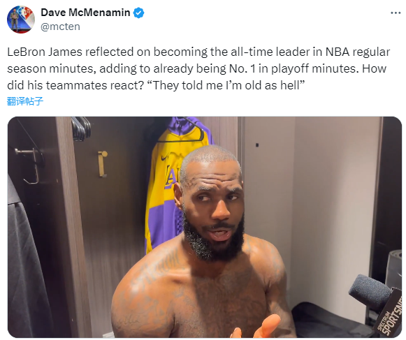 目前詹姆斯常规赛出场57472分钟独享NBA历史第一,生涯场均出战37.9分钟;湖人球员们什么反应呢?詹姆斯透露队友们在更衣室中都调侃:我太老了。