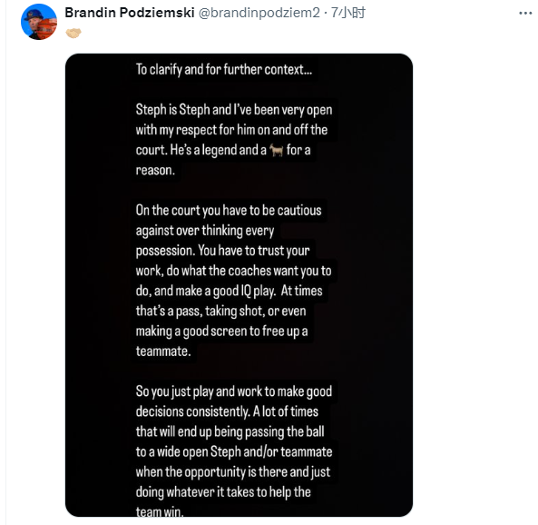 今日波杰姆斯基发文解释了自己的观点,在图片中写道:澄清和进一步说明一下我的观点...库里就是库里,我在场上场下对他的尊敬毫无保留,他是传奇和GOAT是有原因的。