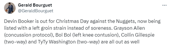 来源:直播车12-25 11:38牛叉NBA录像网讯 北京时间12月25日,太阳官方公布年终大战伤情,布克(腹股沟)、格雷森-阿伦(脑震荡协议)和波尔-波尔(膝盖)都因伤确定缺战掘金;布克继续伤停,杜兰特和比尔再次带队大战掘金,其中比尔深陷交易流言之中。