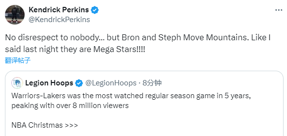 湖人大战勇士和詹姆斯库里对决引爆年终大战,收视率创近5年常规赛新高,名嘴帕金斯发推写道:无意冒犯任何人,詹姆斯和库里真的太厉害了,就像我昨晚说的,他们都是超级巨星。