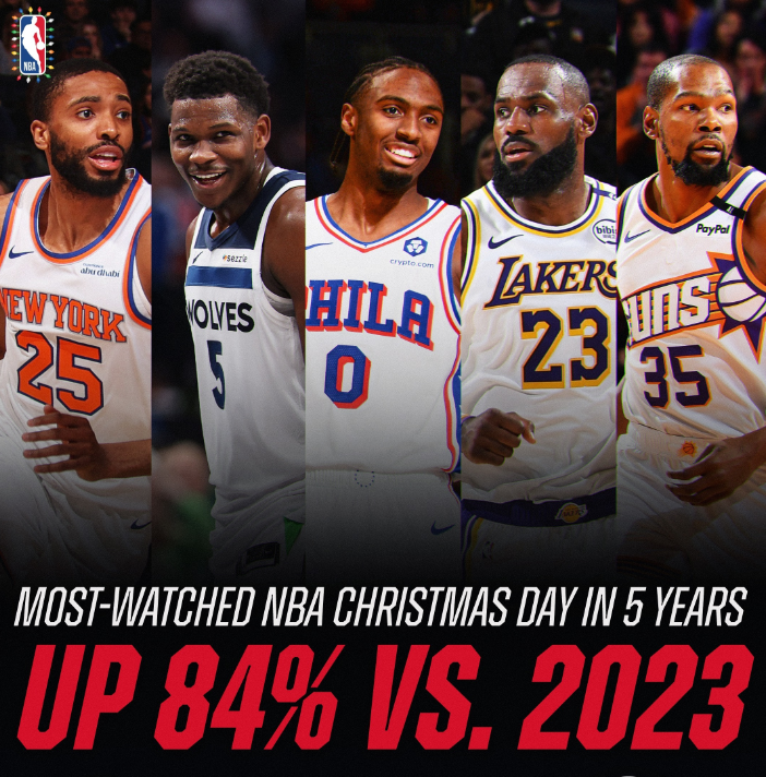 尼克斯与马刺的年终大战平均观看人数为 491万,成为13年来圣诞节首场比赛观看人数最多的一场,比上赛季同期增长了98%;另外太阳和掘金的晚场比赛的平均收视率为384万,成为圣诞节当天观看人数最多的晚间比赛。