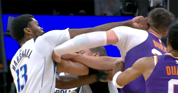 第三节9分02秒,努尔基奇肘击放倒加福德,吃到进攻犯规,对此马绍尔十分不满,之后马绍尔和努尔基奇互喷垃圾话,吵着吵着两人就打起来了,努尔基奇一巴掌打到马绍尔的头部,马绍尔直接挥拳回击,场面混乱不堪,PJ-华盛顿加入战斗,推翻努尔基奇,所幸及时被拉开。