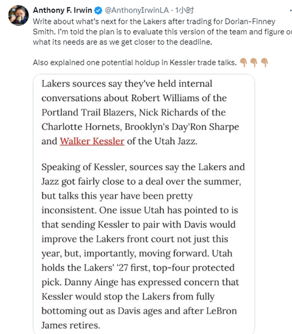 Anthony Irwin继续报道,湖人已经在内部讨论了开拓者队罗伯特-威廉姆斯、黄蜂队理查兹、篮网队夏普以及犹他爵士队凯斯勒。