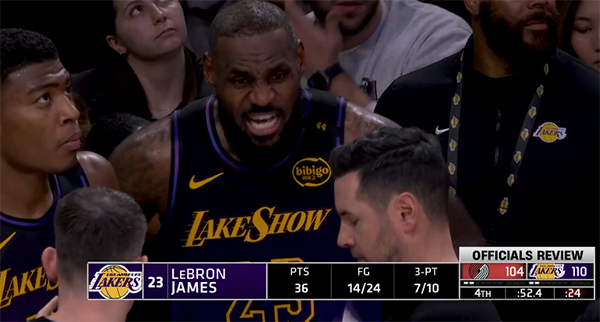 下半场,湖人第三节一直压制开拓者并且扩大领先,单节28-24又赢4分,三节打完领先13分,这一节詹姆斯一个人命中3记三分球,单节贡献9分,期间由于忌惮老詹的三分球,穆雷补防扑倒詹姆斯,后者咬牙十分痛苦。