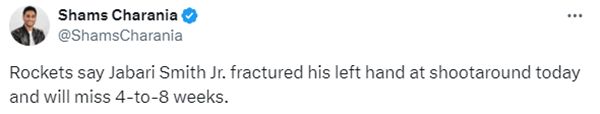 据悉,小贾巴里在训练中手部受伤,之后感觉疼痛加剧,火箭队对他进行了检查,并找到了骨折点,预计需要进行手术治疗。