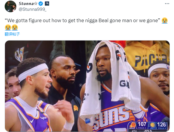 太阳三巨头在场边的一幕引热议,有美球迷调侃杜兰特和布克正在沟通如何让球队送走比尔,还有美球迷发问:比尔已经打完了太阳生涯最后一场比赛了吗?