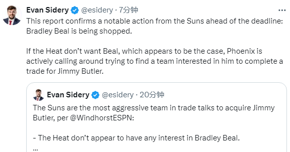 据Evan Sidery报道,目前太阳是追求巴特勒最积极的球队,热火对比尔不感兴趣,巴特勒加盟太阳需要比尔在这笔复杂的交易中放弃交易否决权;如此消息可以证明太阳正在出售比尔,太阳正在积极寻找对比尔感兴趣的球队来促成巴特勒交易。
