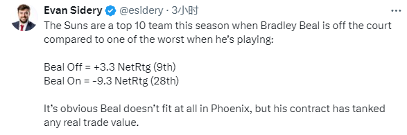 Sidery还发推写道:本赛季,当比尔不在场时,太阳队净效率为+3.3排在联盟第9位,当比尔在场时,太阳净效率为-9.3,排在联盟第28位;很明显比尔不适合菲尼克斯,但他的交易价值已经下架了。
