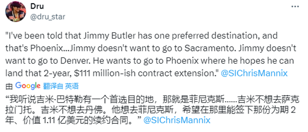 《体育画报》记者Chris Mannix报道:吉米-巴特勒有一个首选目的地,那就是菲尼克斯太阳队,巴特勒不想去萨克拉门托国王,也不想去丹佛掘金;他想去菲尼克斯,希望在那里能签下一份2年1.11亿美元的续约合同。