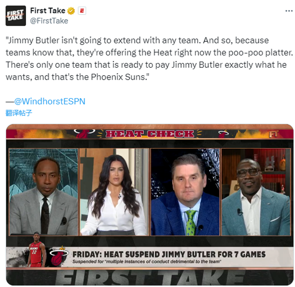 ESPN名记Brian Windhorst报道,吉米-巴特勒不会与任何球队续约。因为球队知道这一点,他们现在给热火队开出了很低的报价,只有太阳一支球队愿意支付巴特勒他想要的薪水。