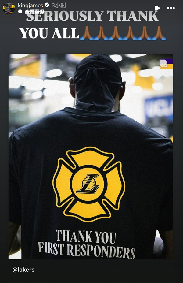 今日湖人官方晒全队身穿印有“感谢你们、消防员”的运动卫衣,并且配文写道:敬保护我们社区的英雄们;詹姆斯转发湖人动态并且评论道:真的非常感谢你们所有消防员。