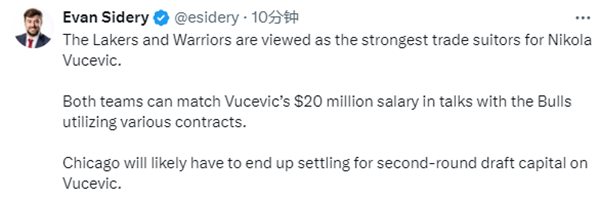 来源:直播车01-13 19:24直播车讯北京时间1月13日,据美记者Evan Sidery报道,目前湖人和勇士被视为是中锋武切维奇的最强追求者,两队都能用资产配平武切维奇2000万美元的合同,公牛最终可能只能用武切维奇换来二轮签的筹码。