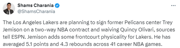 湖人签下篮板悍将杰米森,裁奥利瓦里优化内线