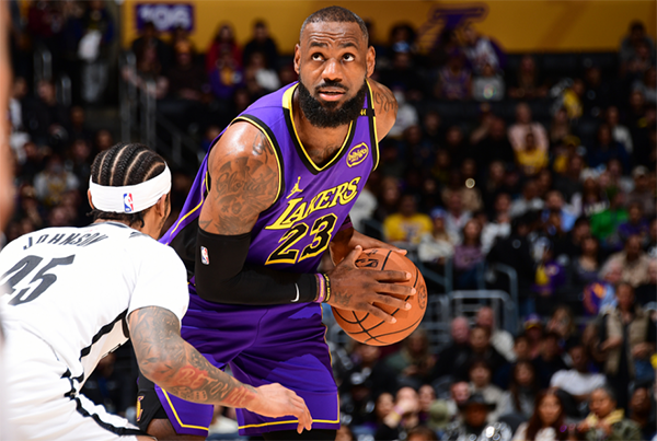 浓眉因足底筋膜炎缺席比赛,詹姆斯继续带队出战,比赛开打后,詹姆斯先是专注于组织进攻,打了6分多钟后下场休息,看到湖人被篮网打出7-0攻势,老詹回到场下并且轰进三分止血,造犯规罚球得分以及轰进压哨三分,40岁老詹连得7分带队反超比分。