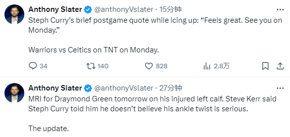 勇士主场逆转击败奇才,维金斯轰下31分11篮板4助攻2盖帽1抢断,打出疯狂一战带队取胜;勇士赢球却连遭伤病打击——第一节追梦突然离场,因左小腿紧张而提前退赛,复出首战仅仅只打了3分钟就伤退;末节关键时刻,库里在防守端大帽普尔,被倒地的普尔压到腿和脚,库里痛苦打滚,一瘸一拐下场并且提前离场。
