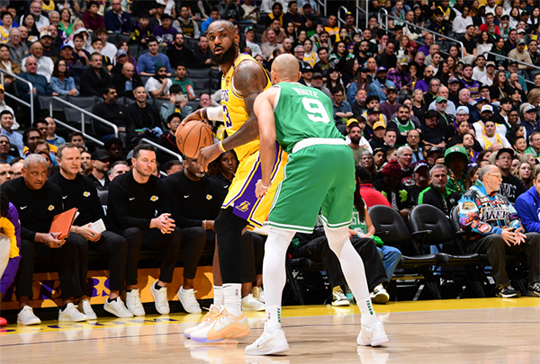 NBA迎来黄绿宿敌对决,湖人开场与凯尔特人疯狂对攻,克里斯蒂和里夫斯都输送三分,第一节最后3分钟绿军进攻哑火,文森特也中三分,40岁詹姆斯在进攻端突然发力,背打翻身后仰稳稳命中,360度转身上篮,更是持球突破上演炸裂劈扣,湖人一波攻势拉开分差,首节34-23领先绿军11分。