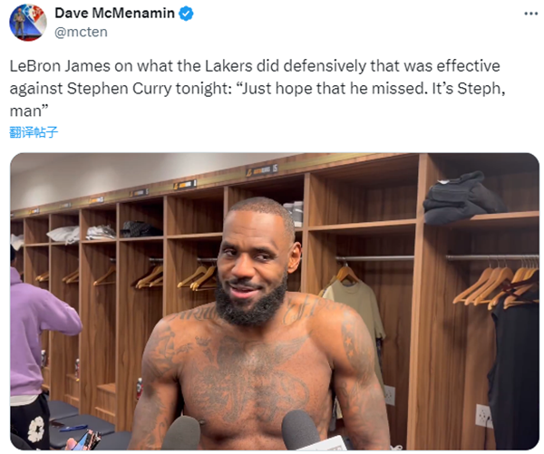 在更衣室中接受采访,谈到库里下半场8投0中一分未得,詹姆斯笑着说道:就是盼着他投不进,他可是库里啊,伙计。用身体去干扰他,然后盼着他投不进。