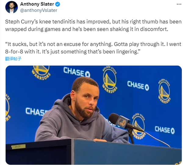 库里还表示自己的膝伤已经好转,但受到拇指伤势的困扰,直言:这很糟糕,但这不是任何事情的借口。你得克服它继续比赛。我之前带伤曾8投8中,今晚它本不该像这样影响我。