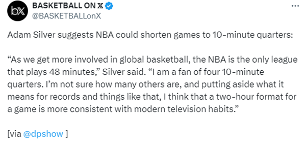 来源:直播车01-30 18:00直播车讯 北京时间1月30日,NBA总裁亚当-萧华公开表示,他支持NBA把每节比赛时间改为10分钟,两个小时的比赛时长更符合现代电视节目习惯。