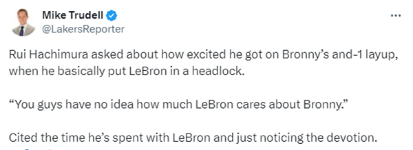 赛后谈到布朗尼打成2+1时他有多兴奋(八村兴奋到几乎把詹姆斯锁喉),八村回应道:你们根本不知道詹姆斯有多在乎布朗尼,我与詹姆斯相处时,留意到的那种深厚父爱。