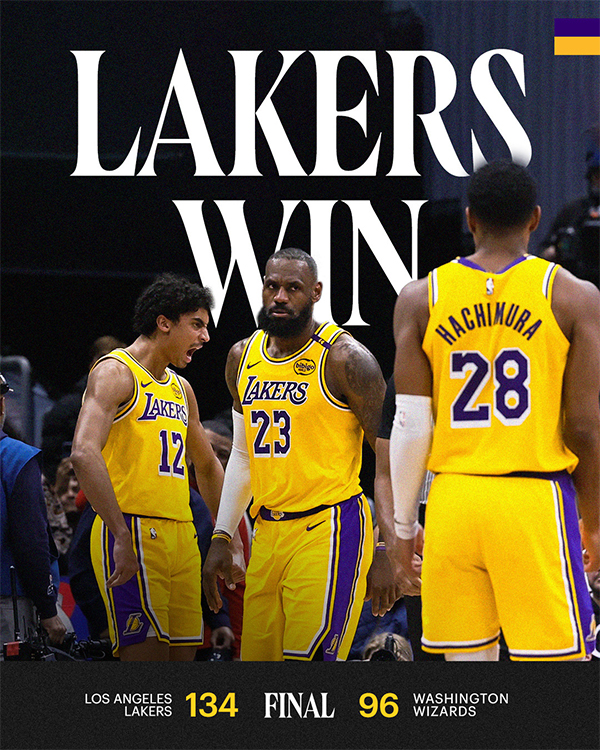 面对联盟倒数第一的奇才,40岁的詹姆斯带领紫金军团早早拉开分差,湖人第一节42-29净胜13分,第二节36-16单节又赢20分,下半场面对奇才的抵抗,老詹带队一波10-0稳住局面,由于领先优势太大,詹姆斯早早打卡下班,末节彻底变成练兵时间,最终湖人134-96轻取奇才。
