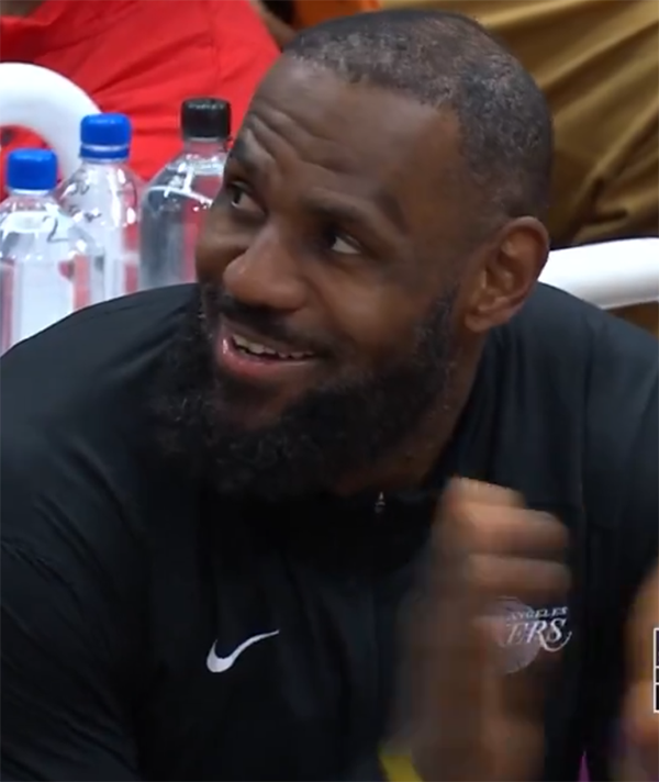 末节练兵时刻,布朗尼获得上场机会,比赛还剩2分48秒,布朗尼持球杀到禁区,无惧2米08的武克切维奇,空中悬停打成不讲理2+1,布朗尼如此一球点燃现场,湖人替补席沸腾了,詹姆斯握拳庆祝,之后八村垒冲过来锁喉按倒老詹;布朗尼罚球时,老詹鼓掌并且又露出笑容。
