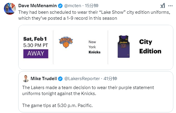 来源:直播车02-02 17:29直播车讯 北京时间2月2日,NBA常规赛湖人客场大战尼克斯,赛前湖人决定更换球衣,据湖人记者Dave McMenamin和Mike Trudell报道,湖人原计划身穿城市版球衣对阵尼克斯,但赛前湖人决定身穿紫色球衣,不穿“LakeShow”城市版球衣。