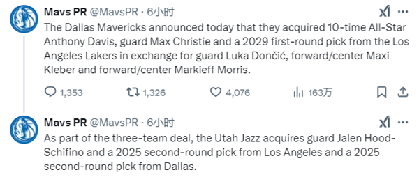 独行侠得到:安东尼-戴维斯、马克斯-克里斯蒂、2029年首轮签(来自湖人)、5.5万美元(来自爵士);